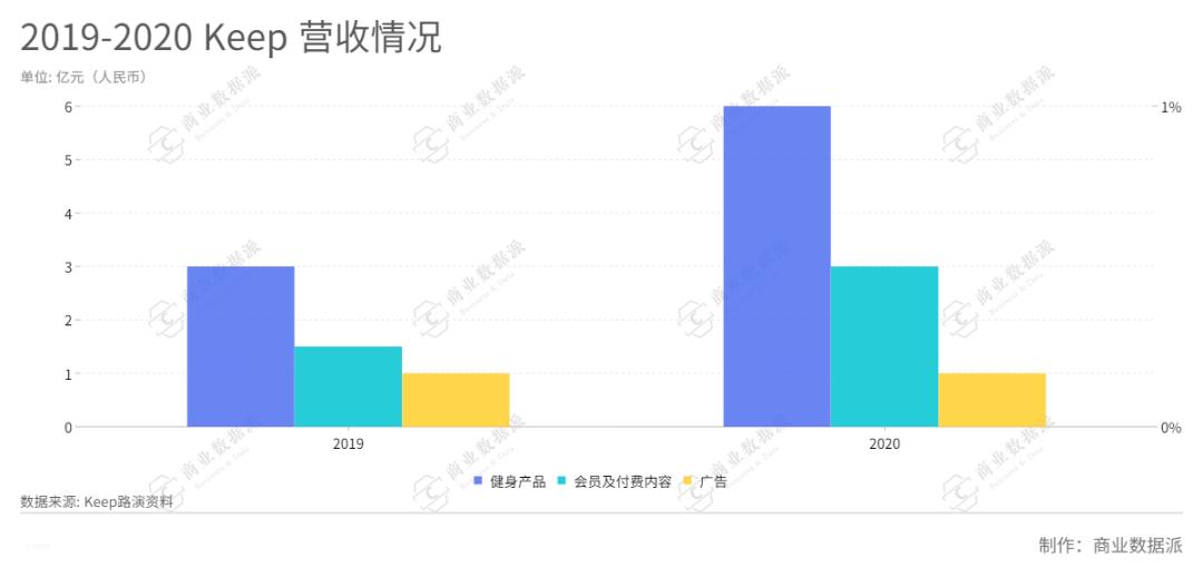 即便如此,智能硬件也已经成为Keep第一大重要营收来源。2019年,其健身产品收入超3亿元,会员及付费内容收入超1.5亿,2020年,健身产品收入超6亿元,会员及付费内容收入超3亿元。