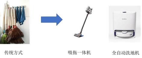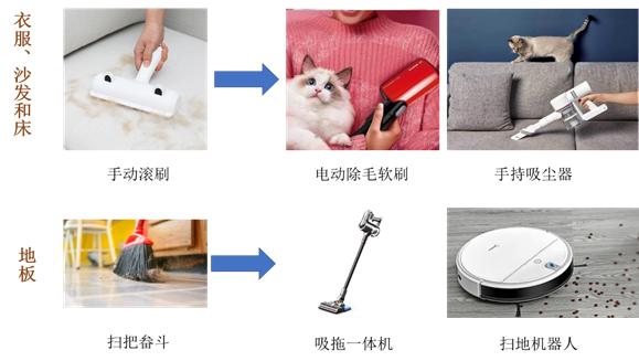 家庭清洁流程中,地面的除毛方式,由传统的扫把、畚斗,过渡到人机结合的吸拖一体机和智能扫地机器人相结合。床铺、沙发和衣服的除毛工作,由传统的手动滚刷,过渡到高效率的无线吸尘器和电动除毛软刷。传统的除臭方式是开窗通风,但这种方式受到天气制约,空气净化机器人可以随时有效监测空气的污染程度并净化空气。排泄物等污渍,则由拖把、扫把和抹布组成的传统手工方式,过渡到吸拖一体机和全自动洗地机相结合。