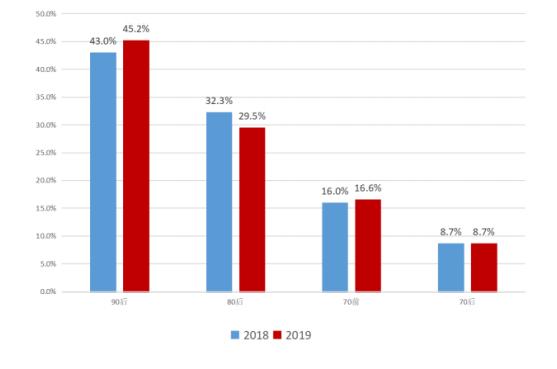 女性和 90 后为主要养宠群体。从宠物主人性别分布看,宠物主人主要为女性,且占了88.40%的大比重,仅有 11.60%的宠物主人为男性。从年龄分布看,90 后是主要的养宠群体,2019 年宠物主人中有 45.5%为 90 后,比 2018 年提升 2.2%,且其中 95 后占比已达到35.6%,说明养宠人群的年轻化。90 后作为养宠主要人群,在消费观念上与中老年人有显著区别,普遍对宠物消费持有更开放的态度。