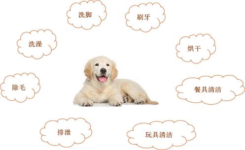 针对宠物自身而言,日常清洁流程包括刷牙、洗脚、洗澡、烘干、除毛、餐具清洁、玩具清洁、排泄等。其中,刷牙指的是每日由宠物主人对宠物的牙齿进行清洁,以预防牙结石;洗脚指的是遛狗后踏入家门前对宠物脚部的清洁;洗澡与烘干指的是对宠物进行周期性的全身清洁;除毛指的是日常对宠物毛发进行梳理和修剪;餐具清洁指的是对宠物的食盆、水盆等餐具进行清洗和消毒;玩具清洁指的是对宠物的毛绒玩具、衣物等进行清洗和消毒。