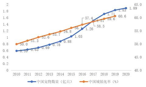 图三:中国宠物数量与城镇化率呈正相关