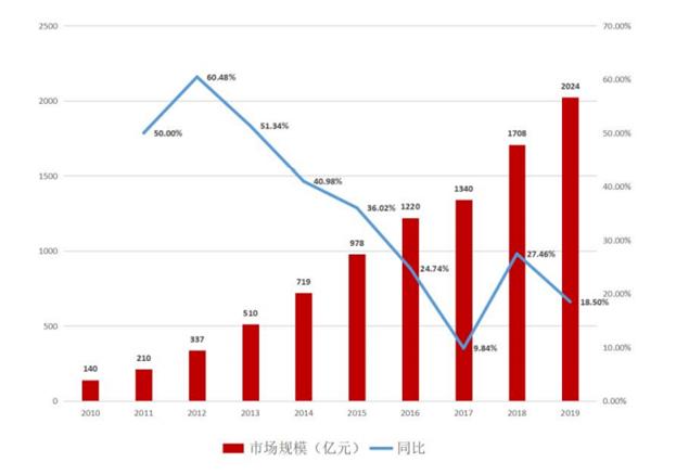2010年以后中国宠物行业进入了高速发展期,宠物数量的增长叠加消费升级是行业增长的主要因素,带动市场规模开始快速攀升。根据中国宠物行业白皮书(以下简称白皮书),中国宠物(犬猫)消费市场规模从 2010 年的 140 亿元增长到了2019 年的 2024 亿元,CAGR 为 34.55%。近几年增速有所下滑,维持在 20%左右,仍属于快速发展行业。根据弗若斯特沙利文的预测,至 2023 年中国宠物市场规模有望达到 4723 亿元,未来几年增速有望维持 20%以上。根据普华永道的预测,从 2019 年开始,在领养率提升和消费升级的推动下,预计未来五年宠物市场规模延续高速增长,年增长率将随之攀升至 24%到 28%之间。