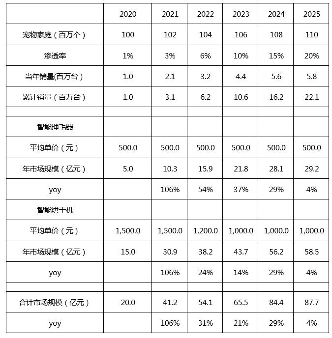 2020年,中国宠物家庭(犬猫)约有1亿户,假设以每年2%的速度增长,到2025年,中国犬猫家庭约有1.1亿户。智能理毛器和智能烘干机的市场刚刚起步,假定2020年为产品推广元年,渗透率为1%。倘若2025年产品的渗透率能做到20%,智能理毛器和智能烘干机的平均单价分别为500元和1000元,2025年宠物清洁市场新产品的潜在规模约为87亿元。加上较为成熟的智能洗脚杯等清洁产品,整体市场规模约为百亿元。