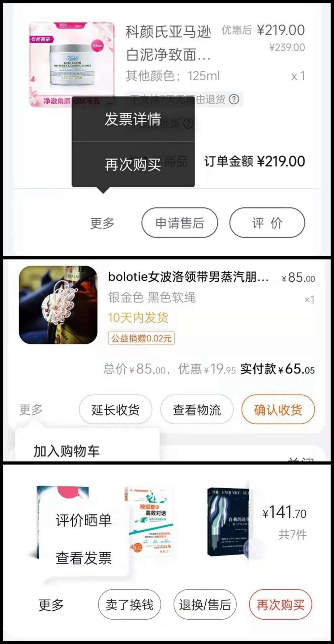 订单列表页有很多项功能,无论是用户想统计一下最近的花销,还是想查看一下所选颜色是否正确,亦或是重复购买之前的某件商品,都不免要点入此页面当中。