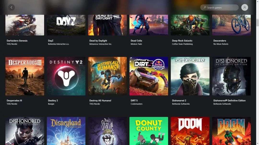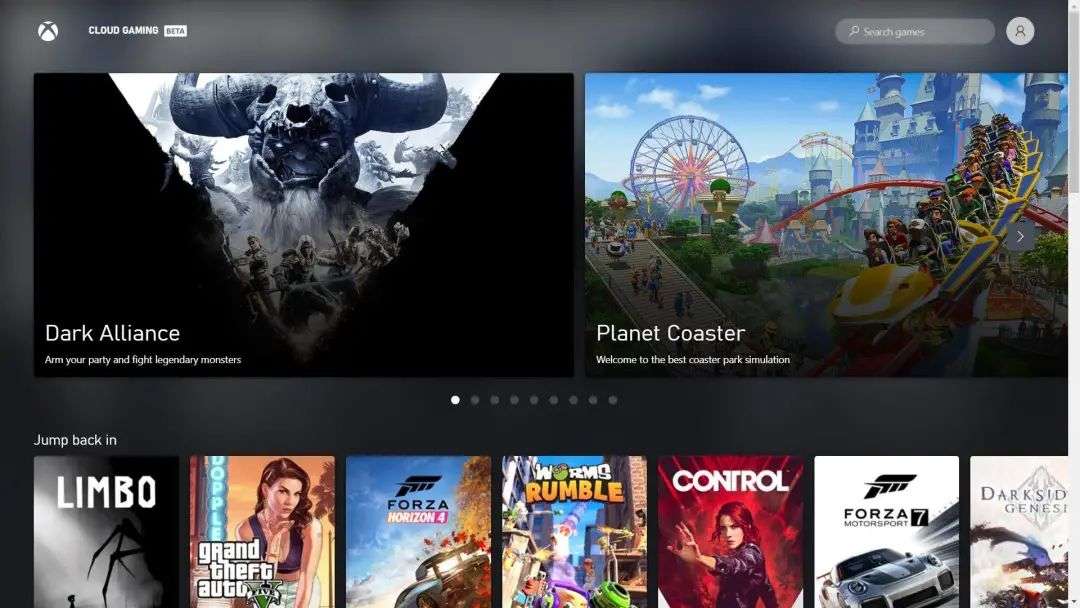 界面风格跟 Xbox 主机端相同,从上至下分别是:新游 Banner、该账户已购入的 XGP 游戏和游戏推荐。