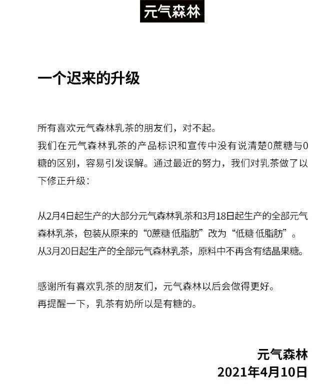 在一款奶茶产品上,元气森林用了“无蔗糖”的说法,实际上还是含糖的,元气森林没有在宣传中解释清楚,让很多用户直接误解成和其他元气森林的产品一样无糖无热量。元气森林甚至被官媒点名批评。