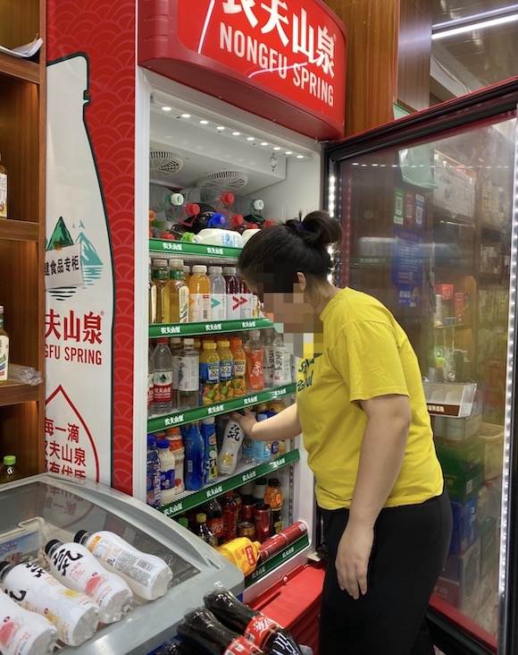 在上述北京南三环的那家烟酒店里,当界面新闻以消费者身份询问店主,将元气森林产品放入农夫山泉冷柜的做法是否得到农夫山泉业务员的允许时,店主立即将元气森林从冷柜中悉数取出,放入一旁厢式冷柜中。其称,农夫山泉的业务员会定期检查,但最近并没有来检查。