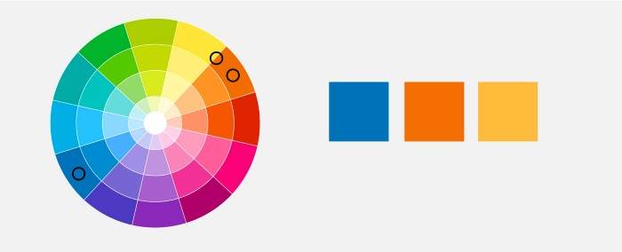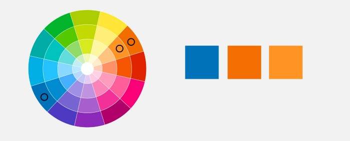 或者还可以更进一步,增加一个类似色来增加活力。这就叫做补色分割配色(Split Complementary)。