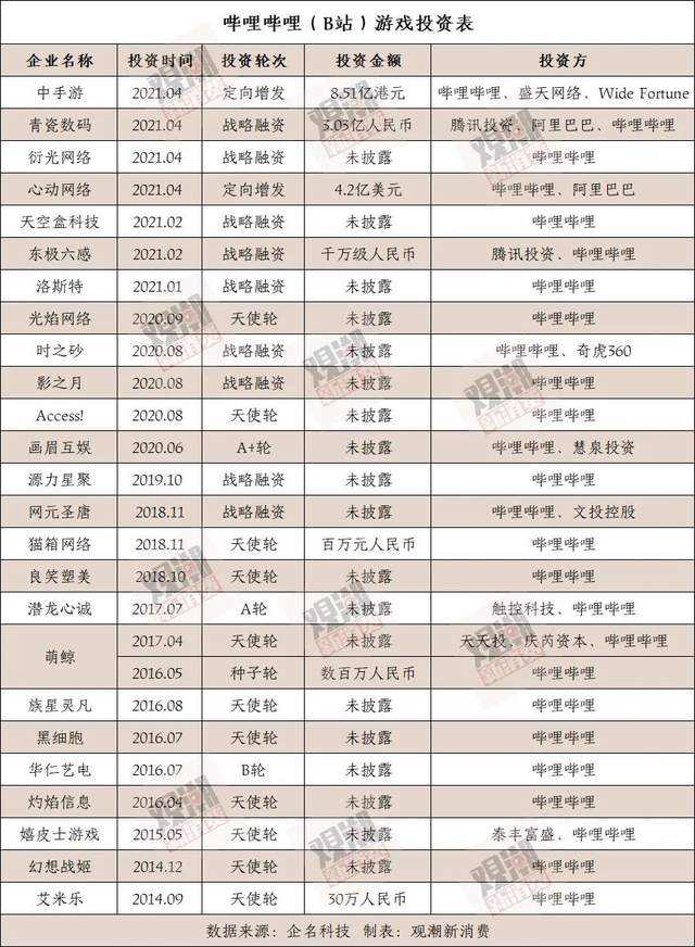 观潮新消费不完全统计,B站投资了包括掌派科技、Access!、时之砂、猫之日、光焰网络、影之月、千跃网络等34家游戏制作公司。B站已经加入腾讯、网易、阿里、字节之列,成为游戏市场中的大买家之一。