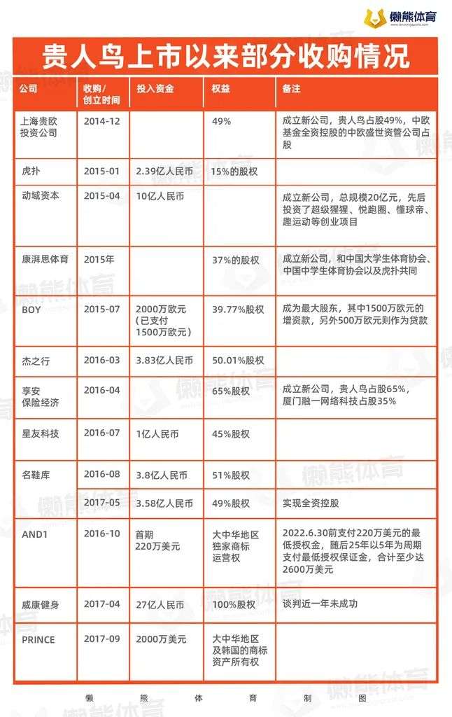 2014年正是国务院46号文发布的那一年,体育产业的发展热情迅速点燃,贵人鸟就是在这样的大背景下开始了大开大合的收购,先后涉足投资、科技、足球经纪业务、体育保险、运动项目管理、健身等。