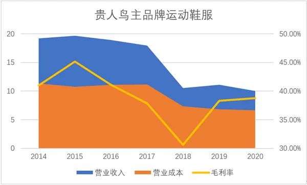 2014年,贵人鸟在招股书和年报中明确提到了品牌发展正在面对的问题,也提到了部分解决方案,可以看出2014-2015年取得了一些成效。2015-2017年,贵人鸟意在扩张,营业收入和毛利率逐年下降,但营业成本却在上升。