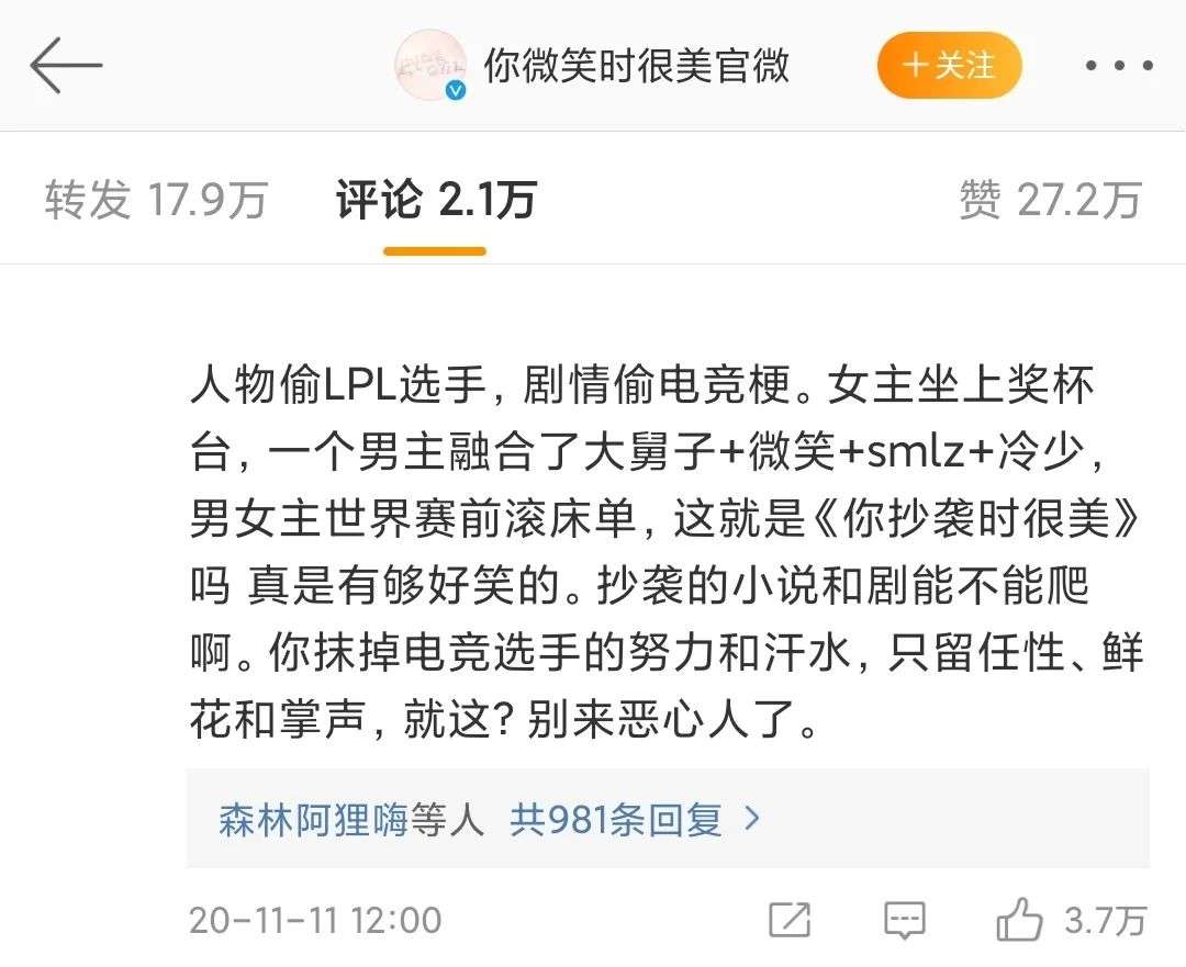 另一边,手机游戏《决战!平安京》因与《你微笑时很美》合作而惹来争议。当OPL职业联赛官博转发剧集相关内容时,评论区更是骂声一片,不少粉丝直呼“丢人”。