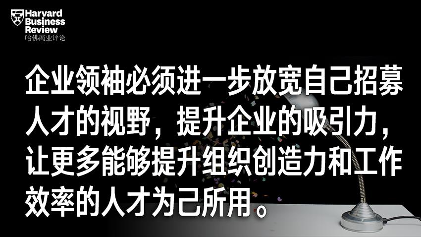 破除空间限制后,企业领袖必须进一步放宽自己招募人才的视野,提升企业的吸引力,让更多能够提升组织创造力和工作效率的人才为己所用。