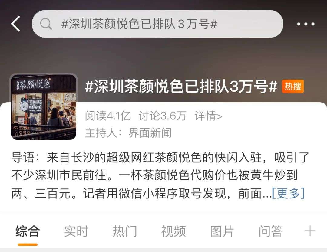 截至2021年7月5日,#深圳茶颜悦色已排队3万号#的话题阅读量已超4亿。图片来源:微博