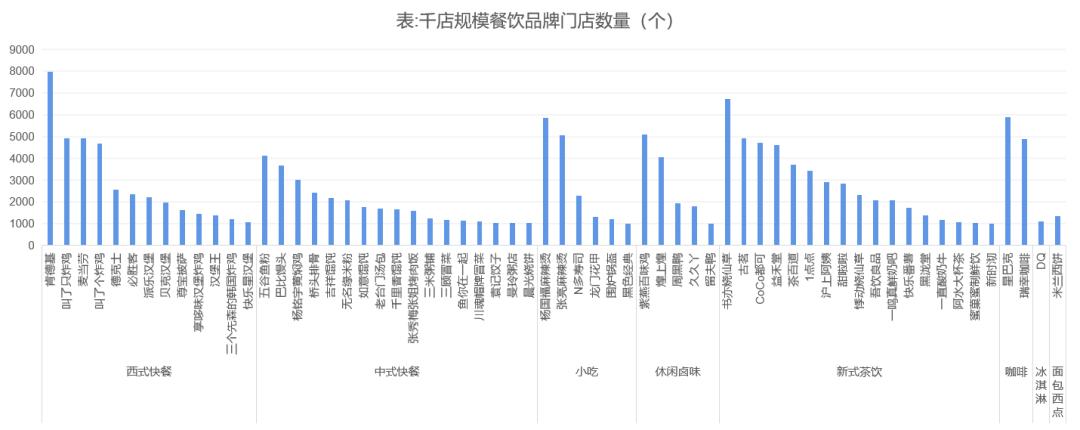 备注:这里的千店规模餐饮企业仅包括窄门餐眼数据中显示门店数量在1000及以上的品牌,非完全统计,且部分品牌的门店数量与实际情况存在一定出入。