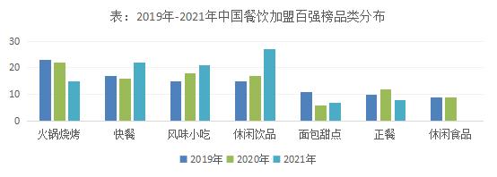 火锅烧烤、快餐、风味小吃和休闲饮品等细分品类具备“天花板、标准化程度高”双高特征。中国连锁经营协会和美团联合发布的中国餐饮加盟百强榜从侧面印证了这一点,对2019-2021年餐饮加盟百强品类分布进行分析后发现,火锅烧烤、快餐、风味小吃、休闲饮品几个品类集中了最多的加盟百强。其中,火锅烧烤类连续上榜的品牌包括小肥羊、东来顺、大龙燚、德庄火锅等;连续上榜的中西式快餐连锁品牌包括赛百味、德克士、杨铭宇黄焖鸡米饭、鱼你在一起等;正新鸡排、杨国富麻辣烫、桥头排骨等连锁小吃品牌连续上榜;休闲饮品品类中,蜜雪冰城、快乐柠檬、沪上阿姨、巡茶等连续上榜。