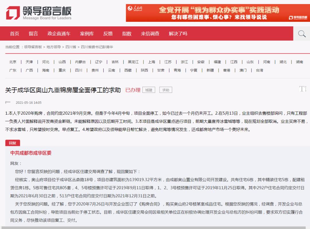 最新的一条回复来自6月15日,成华区区委表示:“经调查,开发企业与总包方因施工合同纠纷,导致项目当前处于停工状态。目前,成华区住建交局会同区级相关单位正在积极协调处理开发企业与总包方的纠纷问题,要求双方切实履行合同义务,尽快推动该项目复工、交付。”