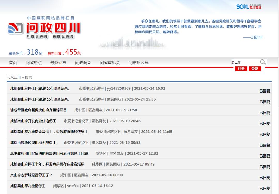 事实上,今年5月项目停工后,愤怒的业主已将奥山控股投诉至了相关部门。在人民网领导留言板块、问政四川平台上,关于奥山府停工问题层出不穷。