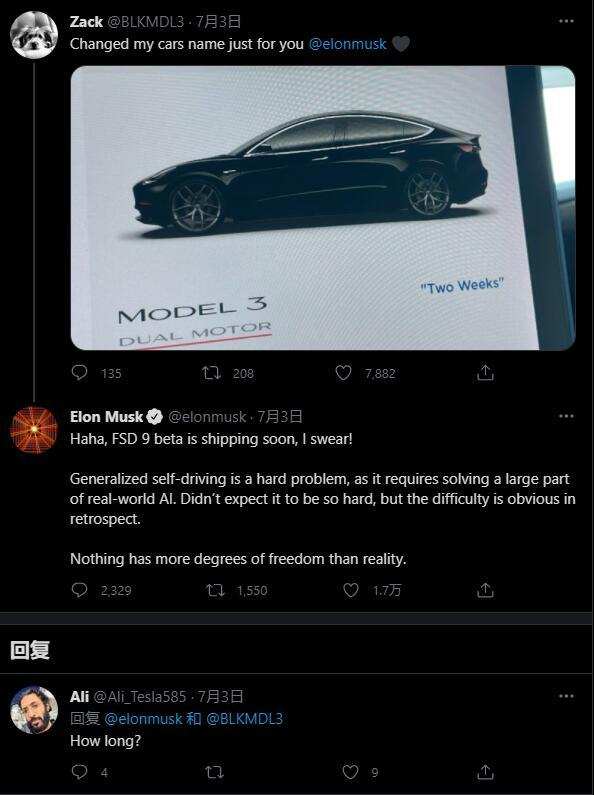 马斯克回应该推文时称,FSD v9测试版很快就会推出,并承认开发安全可靠自动驾驶汽车是个比他想象中更难的问题。他写道:“哈哈,我发誓,FSD v9测试版很快就要发布了!广义的自动驾驶是个难题,因为它需要解决现实世界中很多与AI有关的问题。我没想到会这么难,但现在回想起来,困难是显而易见的!”