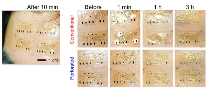该团队的这一设计也已证实非常贴合皮肤:将电子皮肤贴在志愿者的额头上,让他们反复皱眉或是大汗淋漓,也没有出现起皱、剥离和松弛情况。而对照组的其他电子皮肤设计则缺乏汗水渗透性,容易从皮肤上脱落。