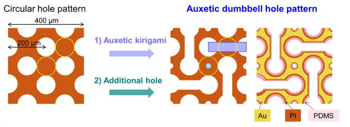 遵循这一基本原理,该团队在薄膜上蚀刻出有呈哑铃形状分布的 “毛孔”(即在每个孔之间 “剪” 出一条通道),就会产生像剪纸般可拉伸的效果。其中内嵌的超薄半导体传感器阵列,则用于实时监测温度、水合作用、紫外线照射和机械应变等数据。