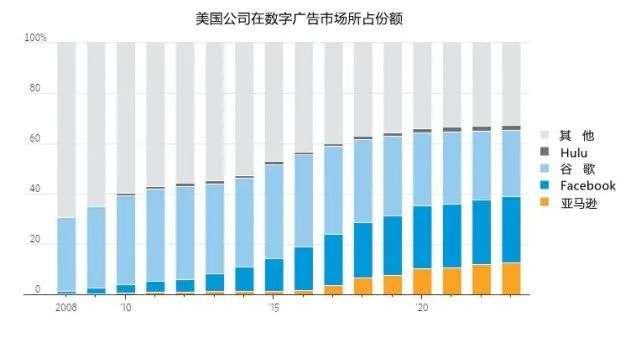 市场研究公司eMarketer的数据显示,亚马逊主导着在线零售领域,约占所有在线销售的41%;该公司还帮助开创了云计算服务,并毫不意外地成为龙头企业;此外,亚马逊也在成为在线广告行业不可忽视的力量,目前正与广告巨头Alphabet旗下谷歌和Facebook展开竞争。