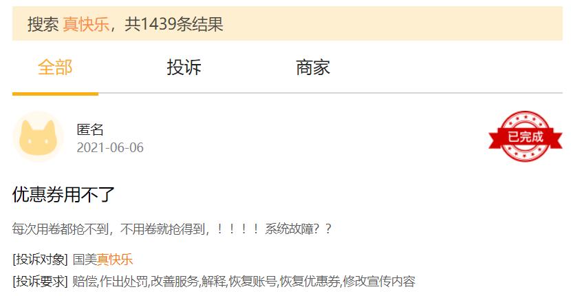 黑猫投诉搜索“真快乐”结果,图源黑猫投诉