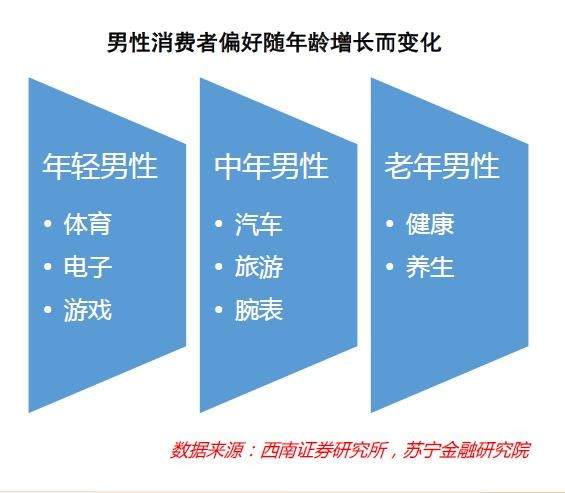 根据中国移动研究院2021年调研数据,男性兴趣爱好消费平均为4.9项,是女性2.5项的1.9倍,男性消费偏好中,年轻男性以电子、手办、游戏、体育为主,中年男性以汽车、手表、高档西服为主。