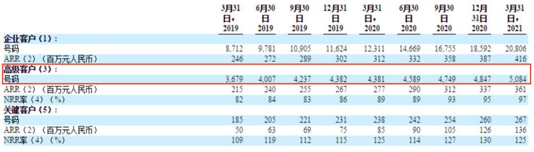 其中,高级客户意为拥有5个注册账户以上的企业客户,关键客户意为收入贡献超过20万的客户。据招股书披露,2019年至2021年一季度,企业客户几乎贡献了所有订阅收入,特别是高级客户,分别贡献2.19亿元,2.71亿元、0.77亿元,分别占总收入的82%,81%、79%。