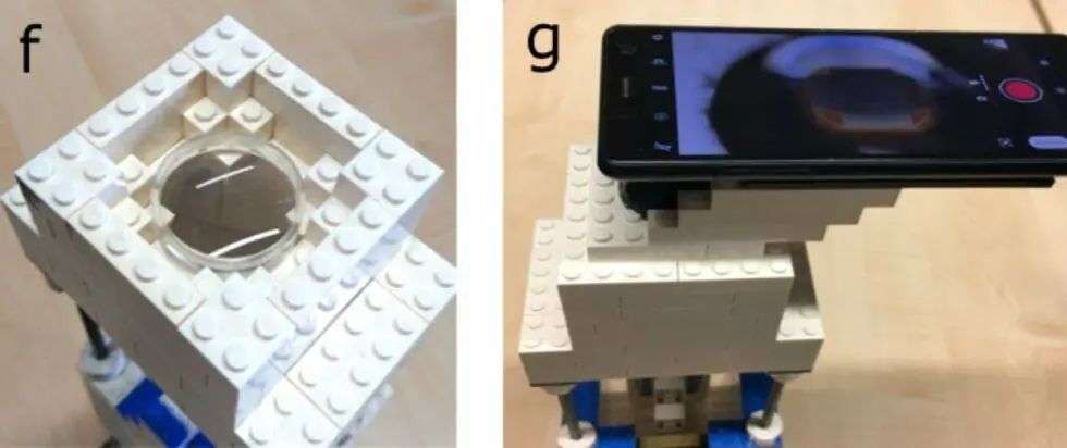 对于照明,他们使用了一种集成了 LED 的特殊乐高积木,另外他们还将一张薄纸放置在 LED 与样品之间,作用类似于摄影灯上的柔光灯罩。