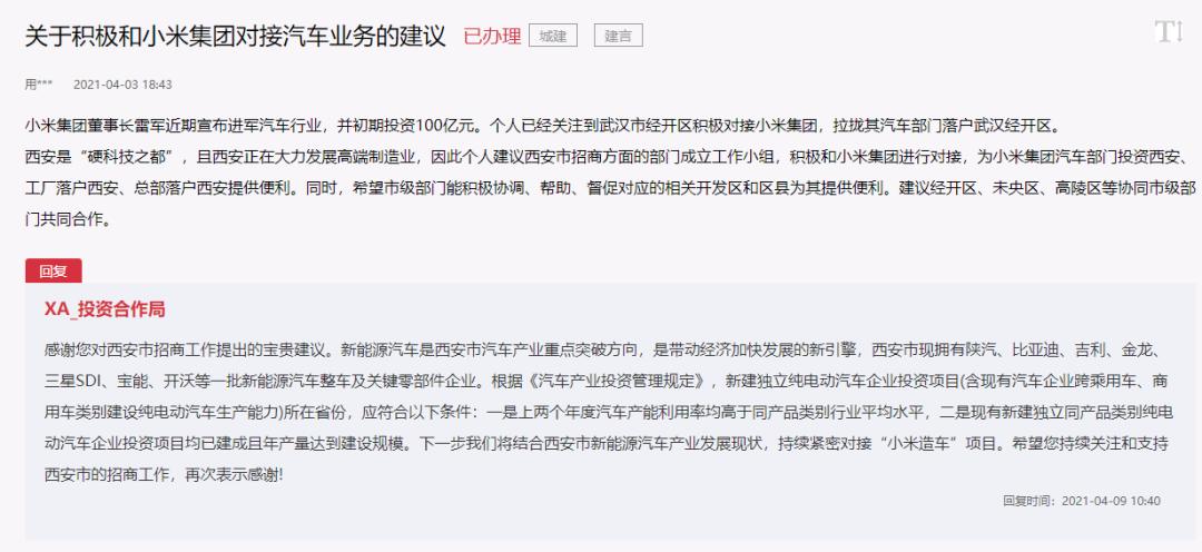 在小米官宣造车后不到10天,西安正式对外宣告,将加入小米造车项目的争夺战。西安多名网友在相关留言板留言,希望西安积极争取小米造车项目。对此,西安市投资合作局统一回复:将结合西安市新能源汽车产业发展现状,持续紧密对接“小米造车”项目。