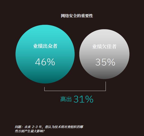 出众企业CEO对于网络安全的关注度也明显高于欠佳企业CEO。在将网络风险视为未来两到三年面临的最大挑战之一的受访者中,出众组的比例要比欠佳组高出 26%。此外,那些希望技术在安全和风险领域发挥最大影响的受访者中,业绩出众企业的比例要比业绩欠佳的企业高出 31%。