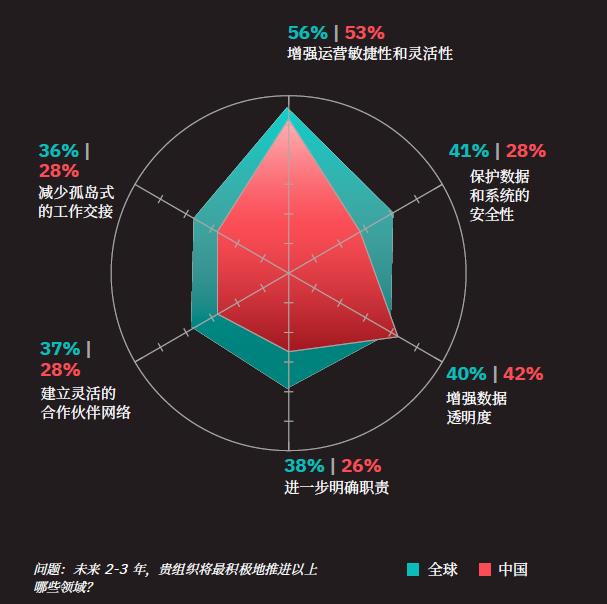 因此,企业敏捷性与灵活性的重要性开始得以凸显。在IBV的此次调研中,全球56%的受访 CEO 强调,在未来两到三年,必须大力增强组织的运营敏捷性和灵活性,即提升组织快速做出响应、调整对策并且不影响发展势头的能力,并将其视为企业领导最主要的优先任务之一。