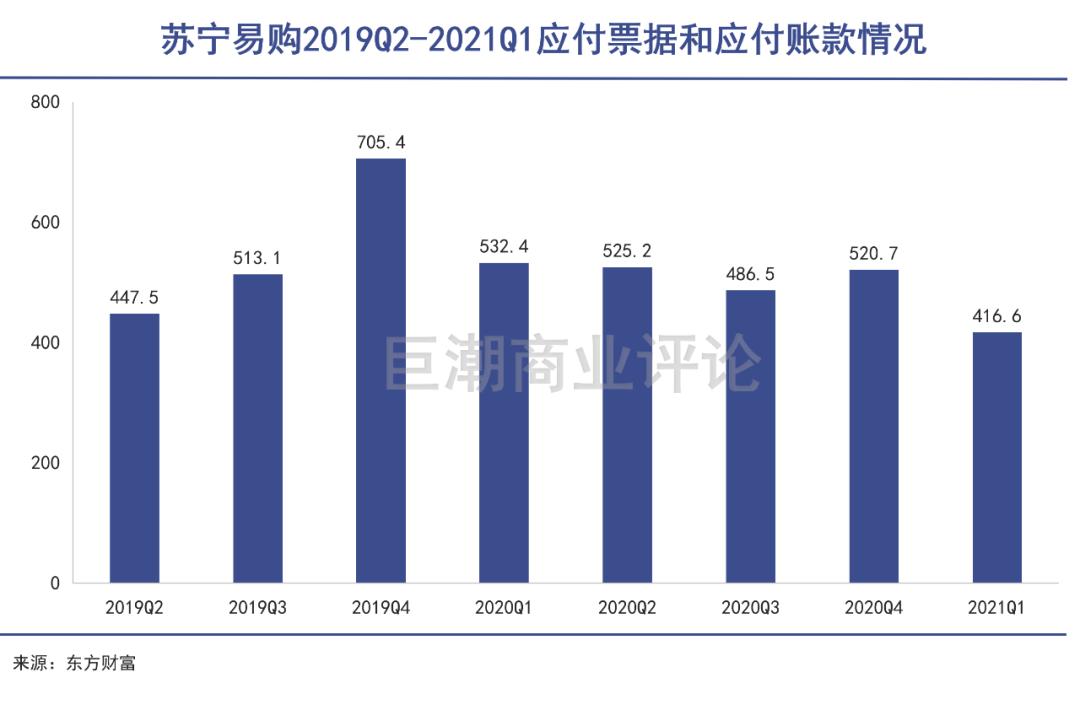 国资、产业资本入股苏宁,宣告着张近东时代的告别。苏宁的股东们在庆幸其股价的涨停,但整个交易的过程中根本就没有赢家。甚至有投资者猜测,苏宁易购2021年一季度账面上仍然存在的416.6亿元(见下图,单位:亿元)应付票据和应付账款,暗示着家电巨头们的入股,或许并非出于主动。