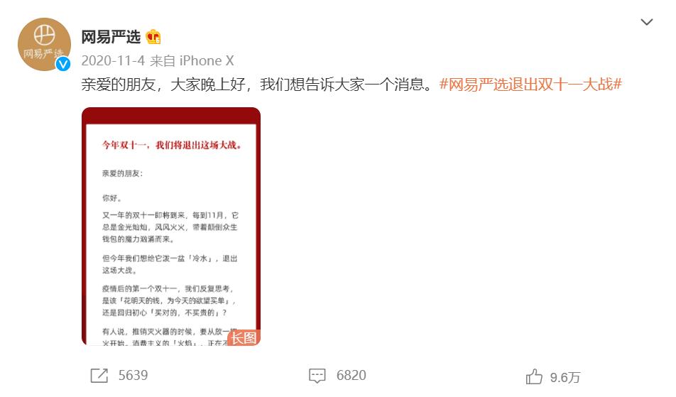 网易严选宣布退出双十一。图片来源:新浪微博