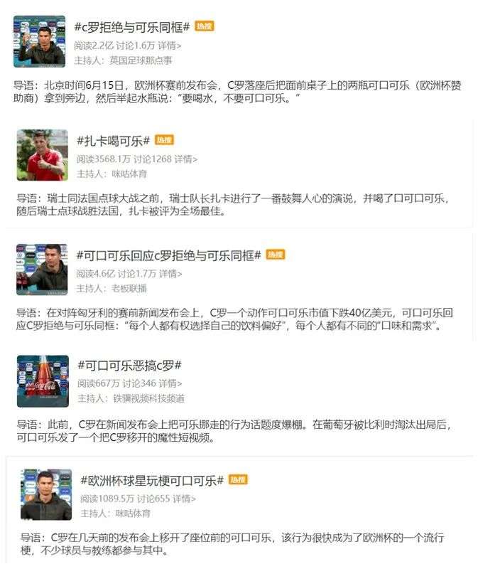 在发布会上,C罗移走可口可乐,成为本届欧洲杯开始后的热门事件。