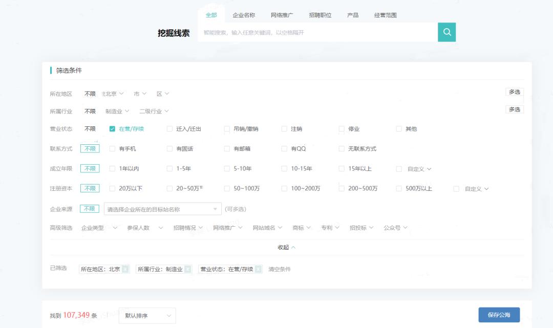 这里举个例子,在“搜索拓客”中,简单地筛选:地区为北京、行业为制作业、营业状态为在营,就能搜索到10W+的信息,还可以根据具体需求来进行进一步筛选,逐渐缩小目标企业范围,海量精准获客。