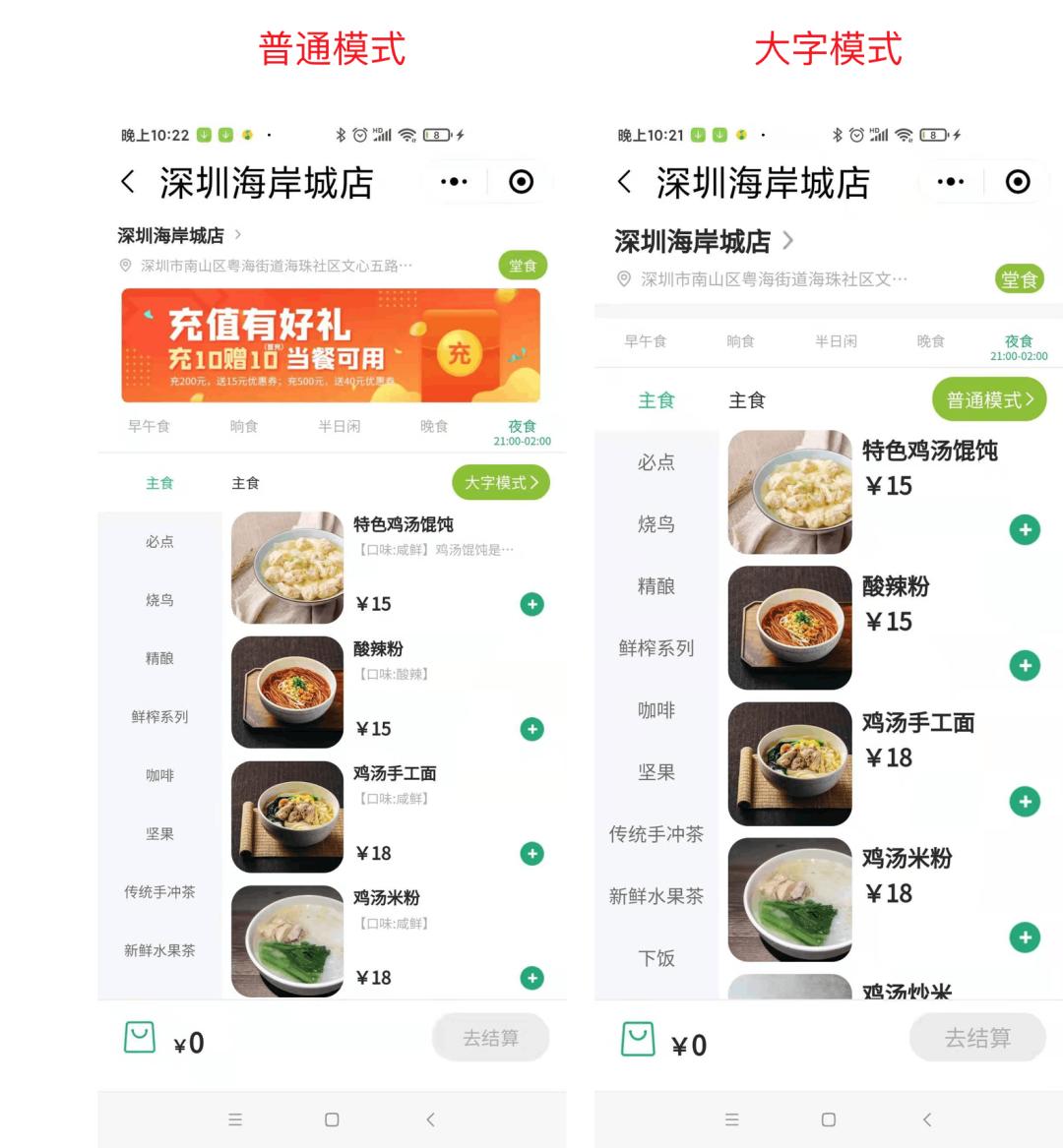 为了解决这个问题,微信支付率先对外提供了提供字体识别大小接口及交互标准,可小程序点餐时切换到“大字大图关怀模式”。