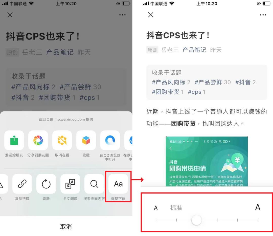 比如公众号文章详情页,点击「...」中的「调整字体」,就能设置所有公众号文章阅读的字体大小。