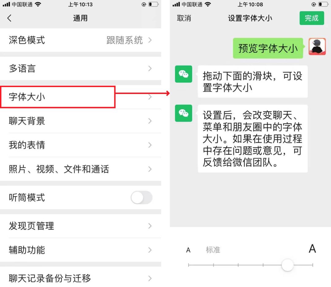 调整大号字后,从聊天列表、聊天对话、通讯录、搜索、发现、个人中心,到公众号、视频号、朋友圈等主要页面,到更深层级页面,字体全局变大。