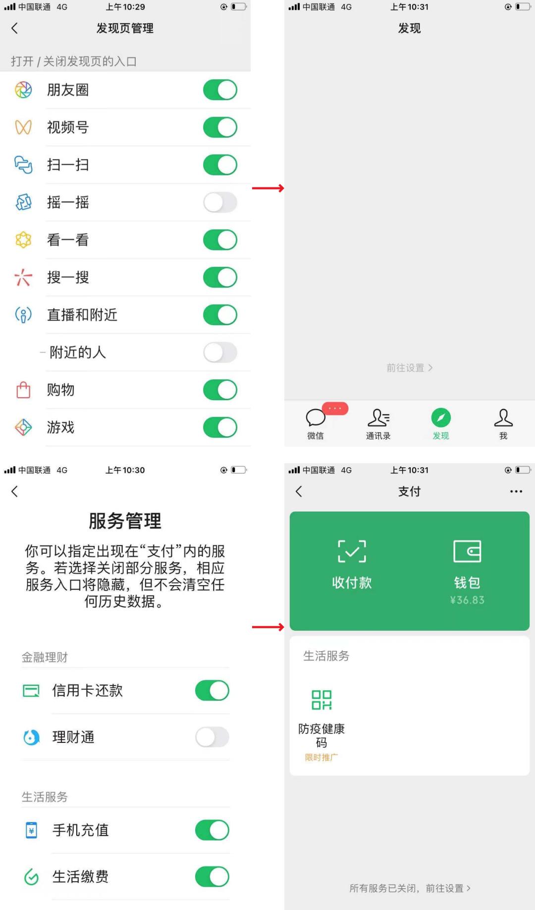 4、为了减少干扰,你可以将发现、支付中的模块关闭,只保留常用的功能