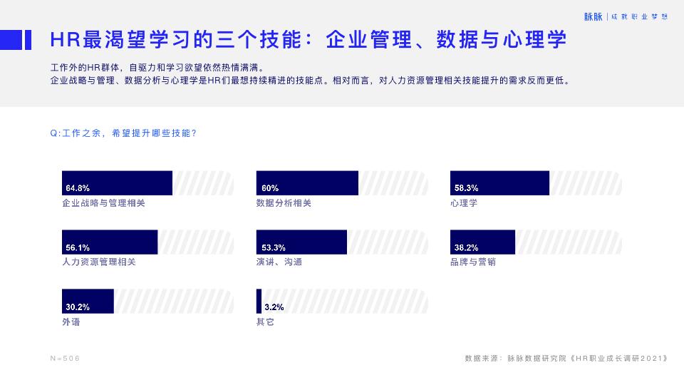 这种焦虑也表现在他们对工作外技能的渴望上。数据显示,HR在工作之外,更渴望提升“企业战略与管理、数据分析、心理学”等方面的技能,从而不断丰富学习维度,拓宽职业发展的可能性。