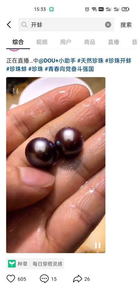 在抖音,开蚌视频层出不穷。主播随便捞出一个不起眼的蚌用小刀轻易一划,就能开出各色正圆珍珠。镜头下,珍珠闪耀着细腻的光泽,仿佛在对屏幕前的你无声呼唤:“快来买我呀!”