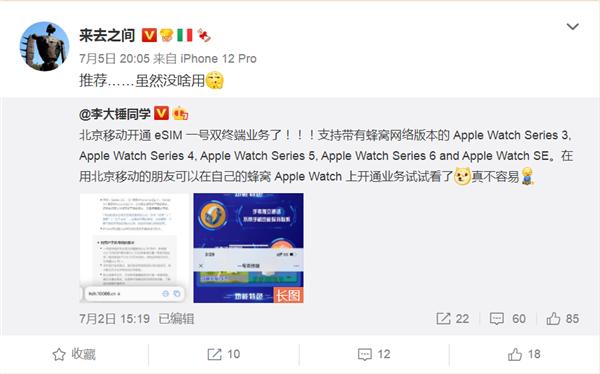 但前段时间一则关于eSIM的新闻却再次吸引了不少用户的目光:7月5日,北京移动正式上线eSIM一号双终端业务,支持带有蜂窝网络版本的Apple Watch等设备开通eSIM一号双终端业务。