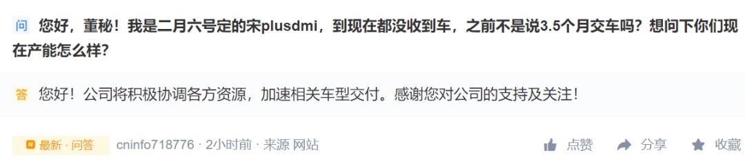 7月5日有投资者在互动平台询问:“为啥2月份定的宋PLUS DM-i车型,现在还没收到货?”