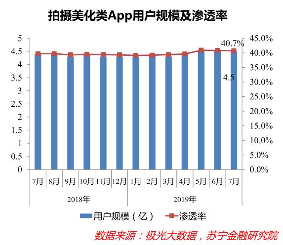 正因如此,拍摄美化类App非常受广大用户欢迎,有数据显示,2019年7月用户规模达4.5亿,渗透率达到40.7%,平均每10个移动互联网用户中,就有4个装有拍摄美化类App。