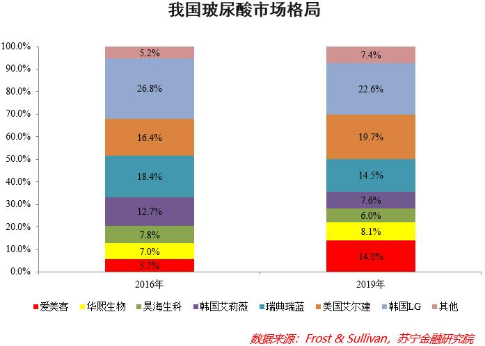 在本土品牌当中,以爱美客、华熙生物和昊海生科为代表的“玻尿酸三巨头”最具竞争力,三者合计占据的市场份额已从2016年的20.5%提升至2019年的28.1%。其中,爱美客的市占率从2016年的5.7%快速升至2019年的14%,华熙生物的市占率则由7%上升至8.1%。