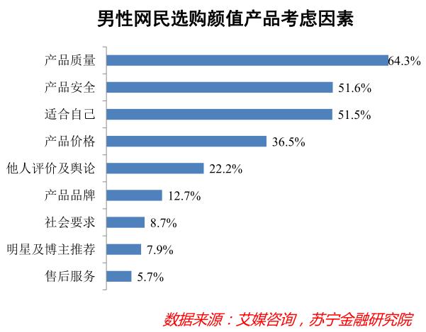 调查结果显示,男性消费者在选购颜值经济产品时,考虑因素的前四位分别是产品效果、产品安全、是否适合自己以及产品价格,整体表现出“务实”的消费特点。
