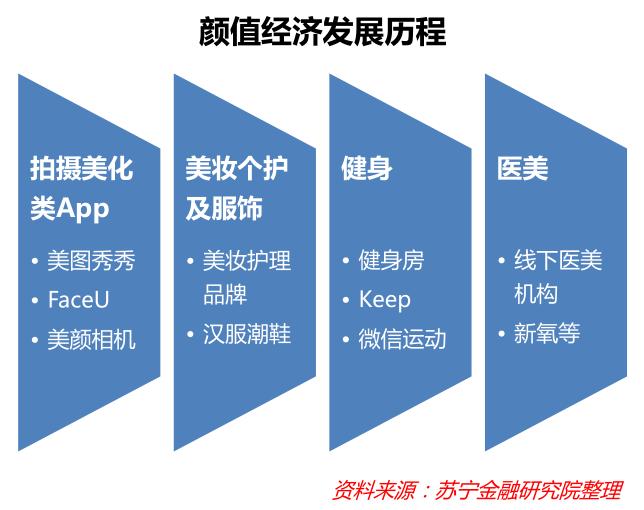 回溯发展历程,颜值经济大体经历了四个阶段,表现为对于颜值追求“从虚到实”的演进,个个都是巨大的风口。