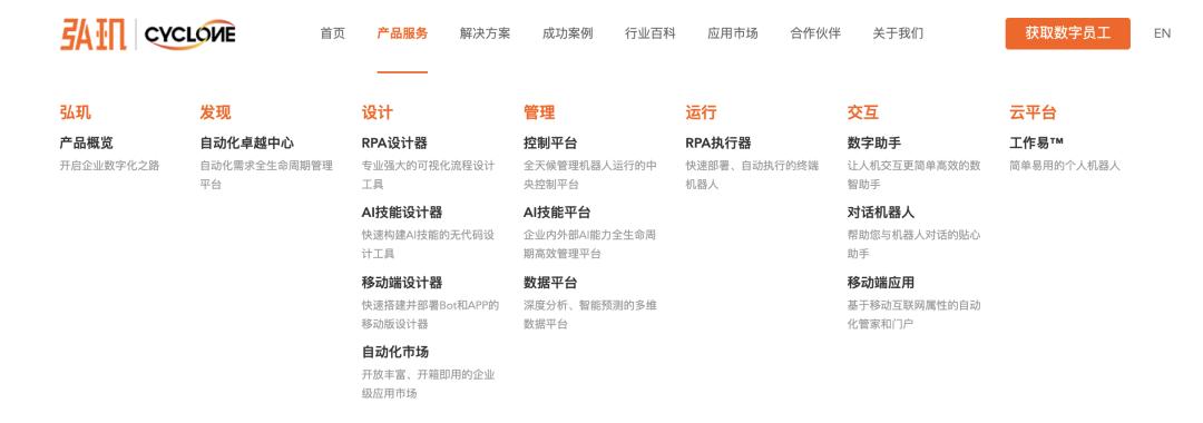 - 弘玑 Cyclone,2015年成立,去年9月完成4000万美元的B轮融资,DCM中国、源码资本、经纬资本、联想创投参投弘玑。与云扩思路相似,它将产品分为5个板块,从发现、设计、数字员工、平台,到云产品。官网显示,弘玑 Cyclone服务于500+银行、证券、保险、政府、能源、制造、医疗、电力等行业中的客户。